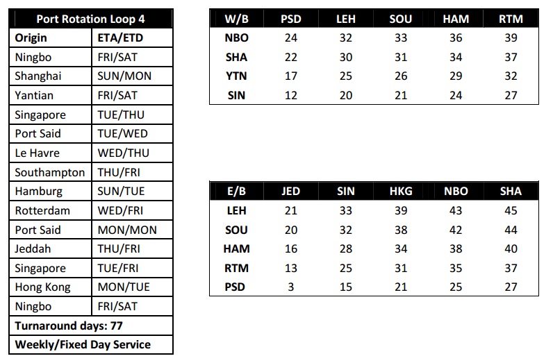 Ningbo – Shanghai – Yantian – Singapore – Port Said – Le Havre – Southampton –Hamburg – Rotterdam – Port Said – Jeddah – Singapore – Hong Kong – Ningbo