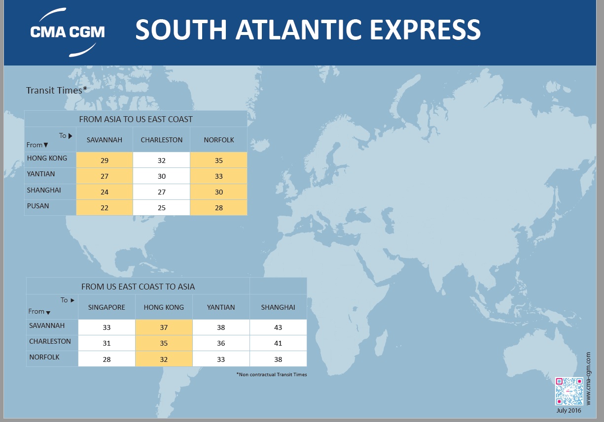 CMA CGM is pleased to announce the start of the new South Atlantic Express service connecting Asia with the U.S. East Coast.