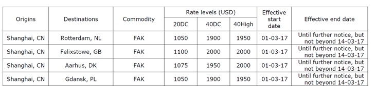 • The above rates are inclusive of Basic Freight Rate (BAS), Bunker Adjustment Factor (SBF), Emergency Risk Surcharge (ERS) and Peak Season Surcharge (PSS)].
