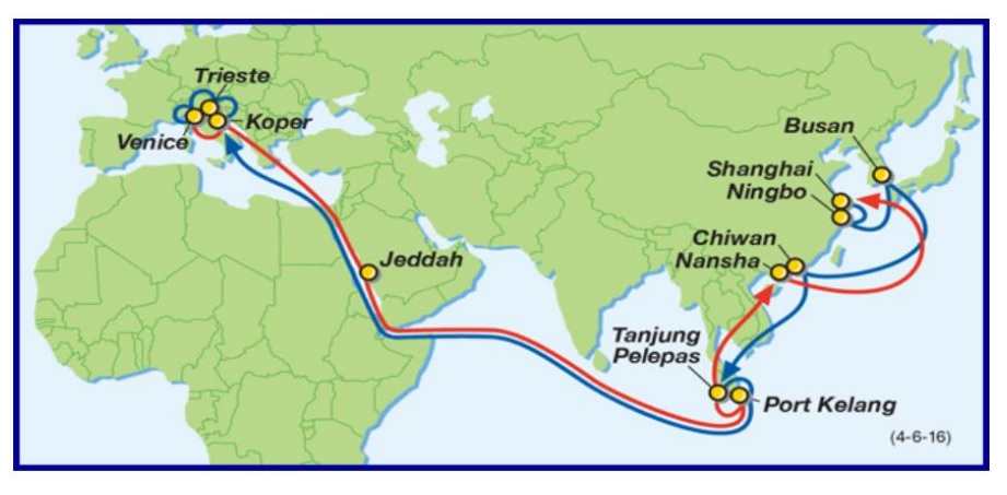 Shanghai (Thu/Thu) — Ningbo (Fri/Sat) — Busan (Mon/Mon) — Chiwan(Fri/Fri) — Tanjung Pelepas (Tue/Tue) — Port Kelang (Wed/Thu) — Suez Canal (Mon/Tue) — Koper (Sat/Mon) — Trieste (Mon/Tue) — Venice (Wed/Fri) — Koper (Fri/Sat) — Suez Canal (Fri/Sat) — Jeddah (Mon/Tue) — Port Kelang (Sun/Mon) — Tanjung Pelepas (Mon/Tue) — Nansha (Sun/Mon) — Shanghai (Thu/Thu)
